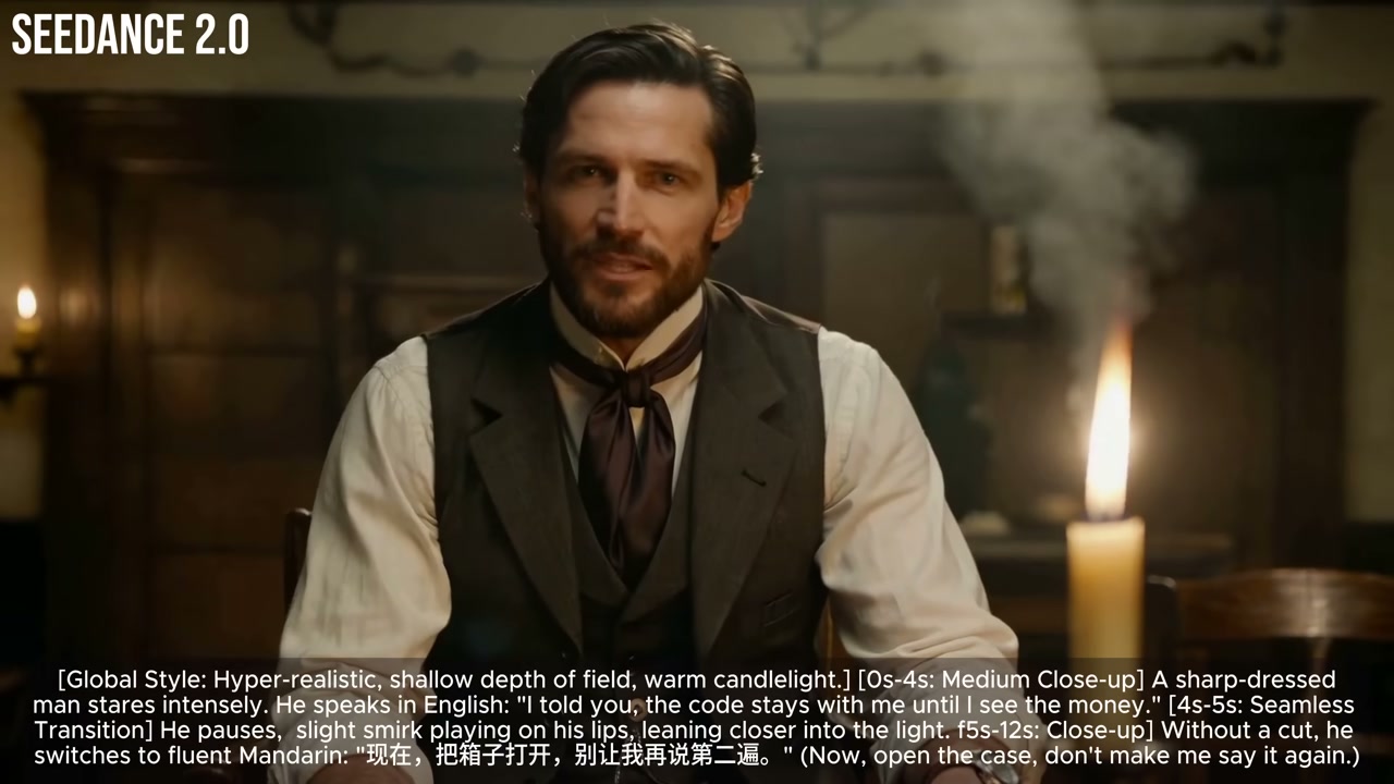 “[Global Style: Hyper-realistic, shallow depth of field, warm candlelight.] [0s-4s: Medium Close-up] A sharp-dressed man stares intensely. He speaks in English: ‘I told you, the code stays with me until I see the money.’ [4s-5s: Seamless Transition] He pauses, slight smirk… [5s-12s: Close-up] Without a cut, he switches to fluent Mandarin: ‘现在,把箱子打开,别让我再说第二遍。’”