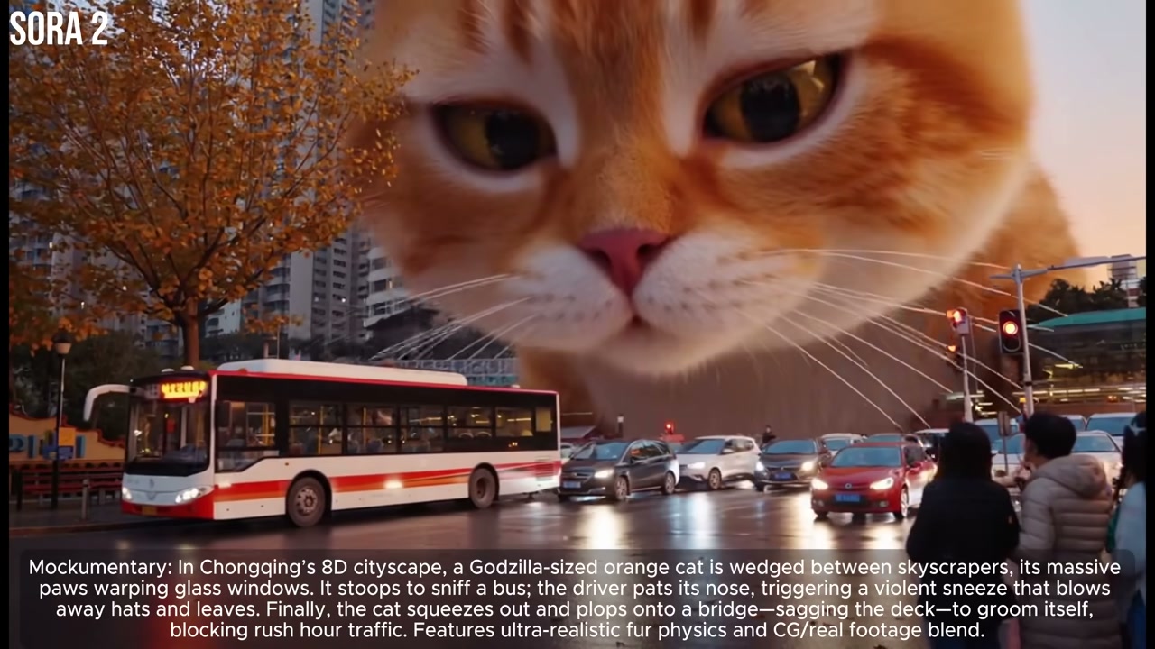 “Mockumentary: In Chongqing’s 8D cityscape, a Godzilla-sized orange cat is wedged between skyscrapers… Features ultra-realistic fur physics and CG/real footage blend.”