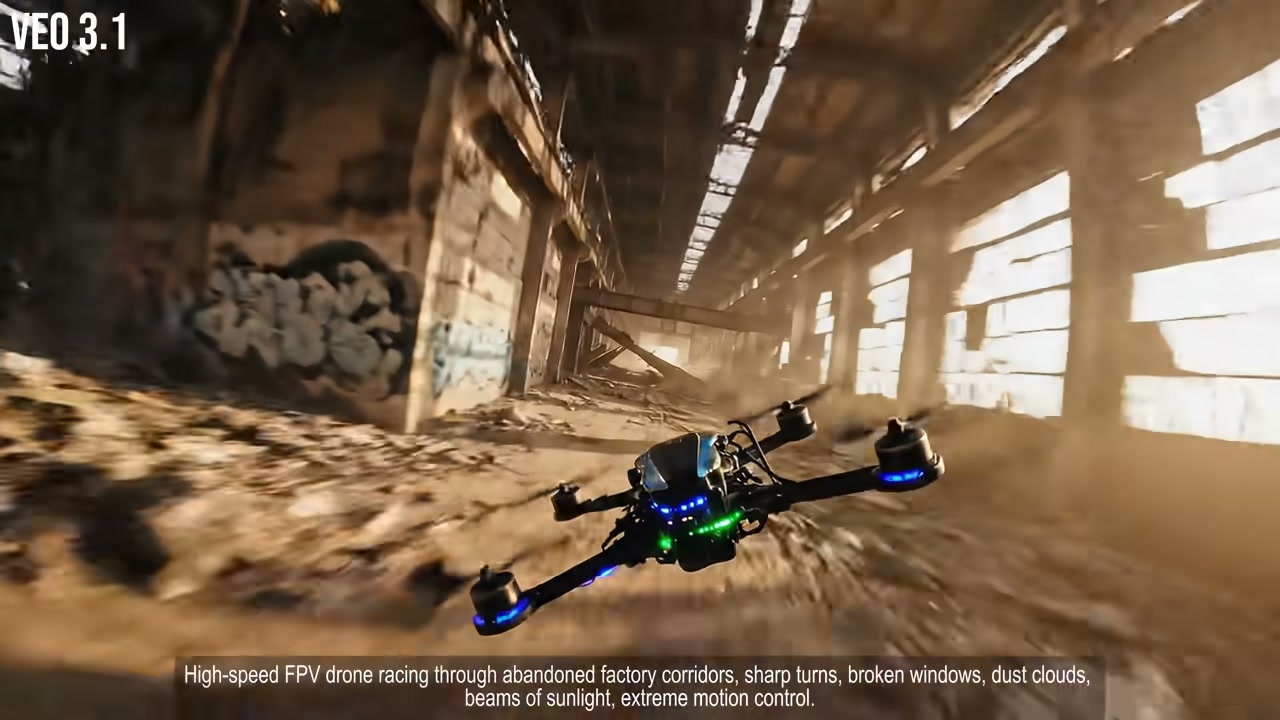 - Veo 3.1 明顯差異:其他模型生成第一人稱穿越畫面,Veo 3.1 卻生成了無人機本體在畫面中飛行的第三人稱視角——對同一 prompt 的理解完全不同